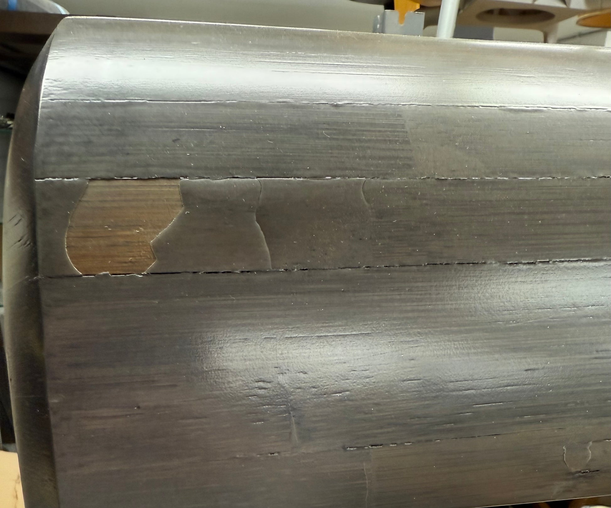 Ron Seff Mid Century Modern Raffia wood cocktail table with marquetry and rounded edge design. Please note one corner has a minor missing piece of the veneer.